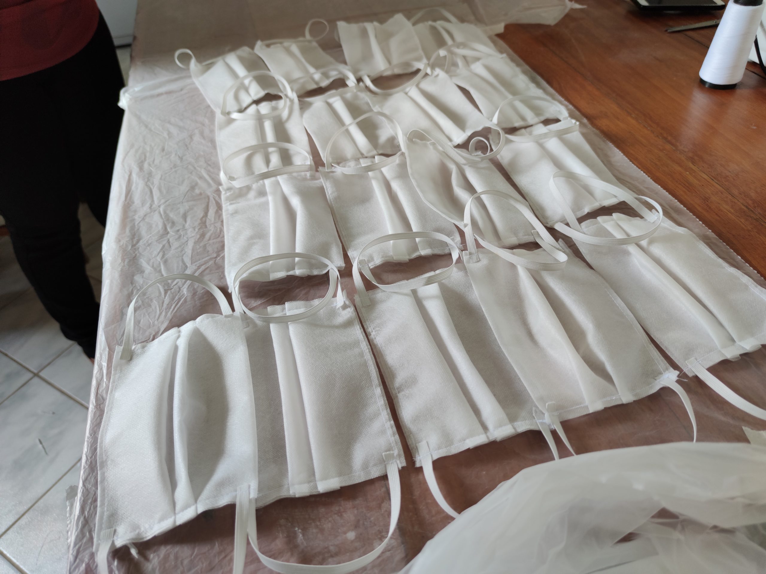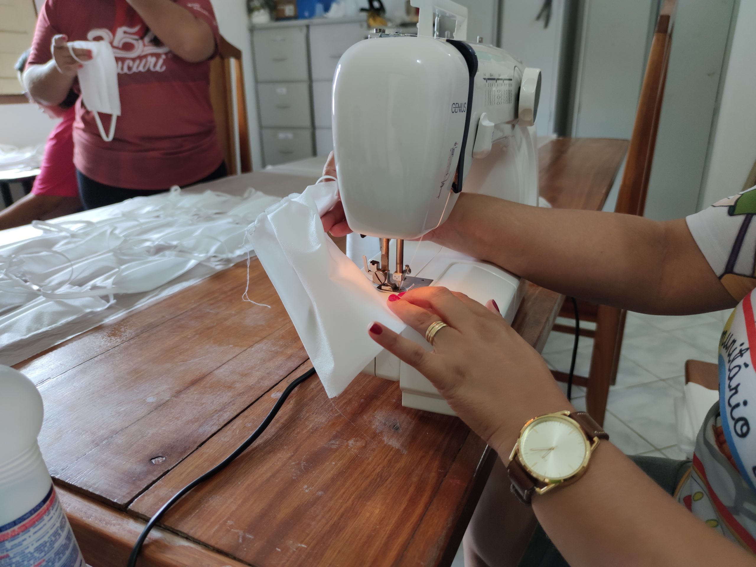 Em média, quatro costureiras confeccionam por dia cerca de 350 máscaras de proteção, o trabalho é revezado em turnos, e, neste mesmo modelo, uma outra equipe realiza o acabamento, onde as máscaras são embaladas e higienizadas.